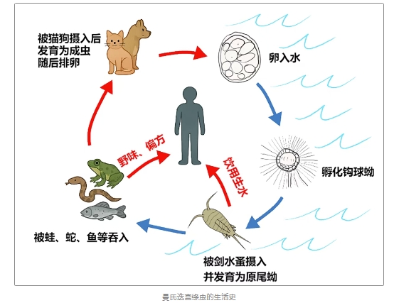 曼氏裂頭蚴的生命周期涉及多個(gè)宿主。成蟲主要寄生在貓、狗等動(dòng)物腸道,產(chǎn)下的蟲卵隨糞便入水后孵化為幼蟲(鉤球蚴);幼蟲被水蚤吞食后在其體內(nèi)發(fā)育成原尾蚴;當(dāng)青蛙、魚或蛇攝入受感染的水蚤,原尾蚴在它們體內(nèi)進(jìn)一步發(fā)育成裂頭蚴;貓、狗等再食入攜帶裂頭蚴的蛙、魚或蛇,裂頭蚴便會(huì)在這些動(dòng)物的腸道內(nèi)發(fā)育為成蟲,完成整個(gè)生命周期。