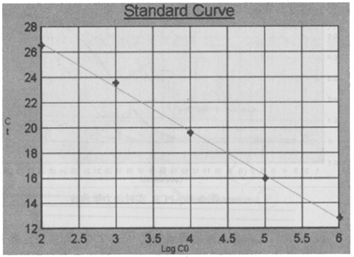 ABI公司首先根據(jù)上述原理研制了ABI 7700 等系列定量PCR儀,在PCR反應(yīng)中設(shè)置標準模板系列(一般5~7個標準濃度)反應(yīng)管和空白對照管。通過實時檢測反應(yīng)管中的熒光信號,計算出RQ+、RQ-、△RQ。RQ+代表樣品管熒光報告基團發(fā)光強度與淬滅基團發(fā)光強度的比率,RQ-代表空白管中二者的比率,△RQ(△RQ = RQ+-RQ-)代表PCR過程中熒光信號變化量。當熒光信號增強到某一閾值(根據(jù)熒光信號基線的平均值和標準差,計算出以99.7%的置信度大于平均值作為閾值)時,標準模板反應(yīng)管所用的循環(huán)次數(shù)(Ct值)就被記錄下來。Ct值與標準模板數(shù)量的對數(shù)值之間有嚴格的線性關(guān)系[3],利用系列標準模板的Ct值,制成標準曲線(圖3),根據(jù)待測樣品的Ct值,就可在標準曲線中確定待測樣品起始的DNA數(shù)量。根據(jù)數(shù)據(jù)處理,即可得出定量結(jié)果。探針設(shè)計一般應(yīng)符合以下條件[2]:①探針長度應(yīng)在20~40個堿基左右,以保證結(jié)合的特異性。②GC堿基含量在40%~60%,避免單核苷酸序列的重復(fù)。③避免與引物發(fā)生雜交或重疊。④探針與模板結(jié)合的穩(wěn)定程度要大于引物與模板結(jié)合的穩(wěn)定程度,因此探針的Tm值要比引物的Tm值至少高出5℃。另外,探針的濃度,探針與模板序列的同源性,探針與引物的距離都對實驗結(jié)果有影響。