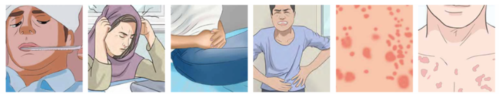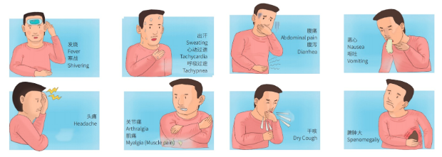 媒介伊蚊叮咬患者或隱性感染者后,通過(guò)叮咬傳播給其他人。潛伏期為1~14天,多為4~7天。臨床癥狀表現(xiàn)為發(fā)熱(可持續(xù)2~7天),劇烈頭痛、肌痛、關(guān)節(jié)痛、眼眶痛、食欲減退、惡心、嘔吐和皮疹,嚴(yán)重時(shí)可發(fā)展為重癥登革熱,出現(xiàn)出血、休克等危險(xiǎn)情況。