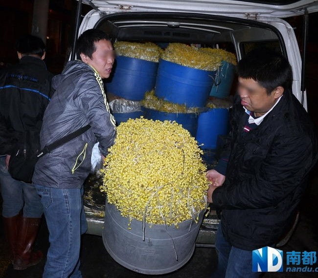 3月5日凌晨5時(shí)24分,海珠金溪農(nóng)貿(mào)市場(chǎng)門前,埋伏一夜的干警截獲一輛滿載上千公斤毒豆芽的面包車。南都記者 馬強(qiáng) 攝